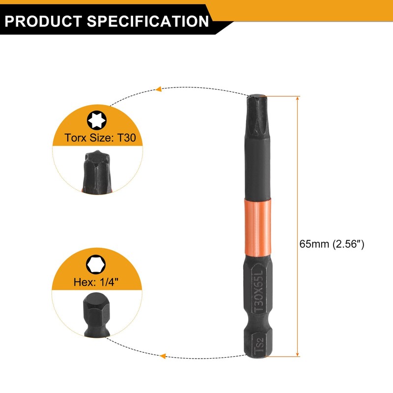 - Size - Torx head size: T30; hex shank size: 1/4"; overall length: 65mm (2.56"); special design: torx head without hole; hardness: HRC59-61 (The recognized stable hardness is around HRC60.).