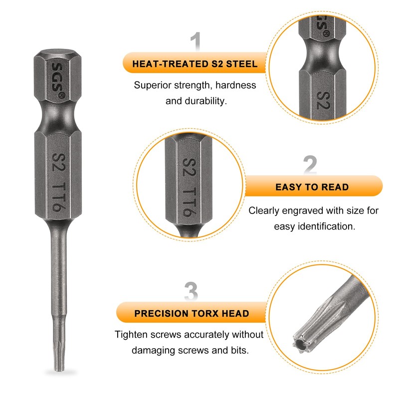 - Size - Security torx head size: TT6; hex shank size: 1/4"; overall length: 50mm (2"); hardness: HRC59-61 (The recognized stable hardness is around HRC60.). Torx head with hole can be in close contact with the screw, making it more stable and less likely to slip during disassembly and assembly.