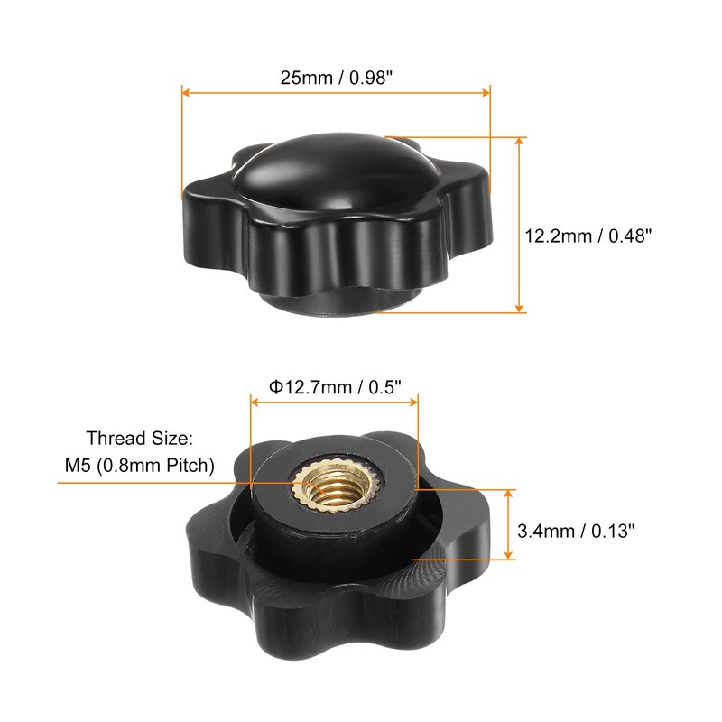 • Size - Standard thread size: M5 (0.8mm Pitch); head diameter: 25mm / 0.98"; total thickness: 12.2mm / 0.48"; stepped part size: 12.7mm x 3.4mm / 0.5" x 0.13" (D*T); knob style: 6 star, non-through hole, brass insert; color: black
