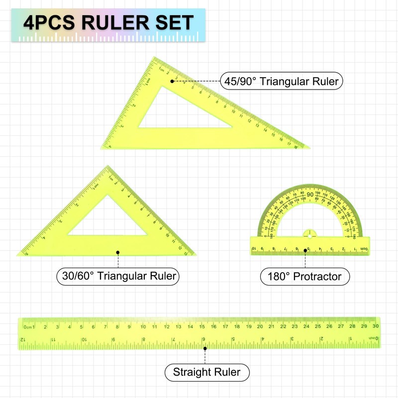 - Package Content - 1pcs straight ruler, 1pcs 30/60 degree triangle ruler, 1pcs 45/90 degree triangle ruler, 1pcs protractor. Different types of rulers can meet different drawing needs and improve measurement and drawing efficiency.
