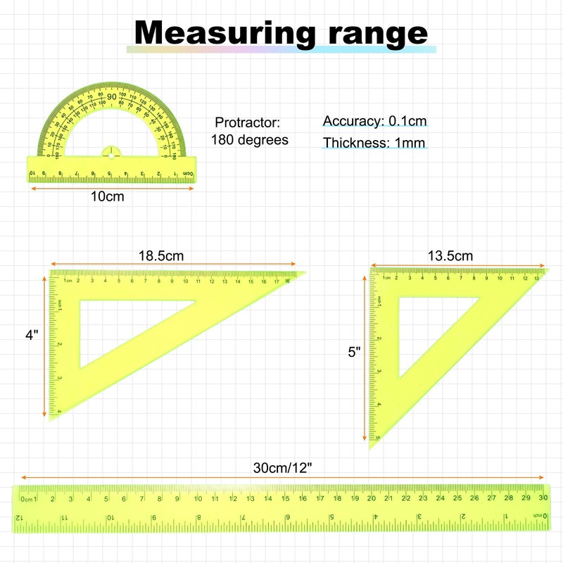 - Material - Triangle ruler set is made of plastic, strong toughness, lightweight and easy to carry. Semi-transparent colors allow for clearer measurement of objects.