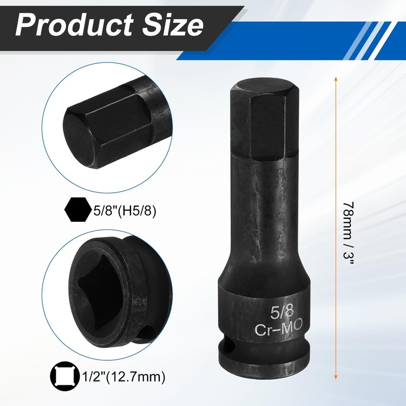 - Size - 5/8 inch 6-point socket; 1/2" square drive socket; 78mm / 3" total length. Each package includes 5pcs x 6-point socket and 5pcs x cotter pin and 5pcs x O-ring