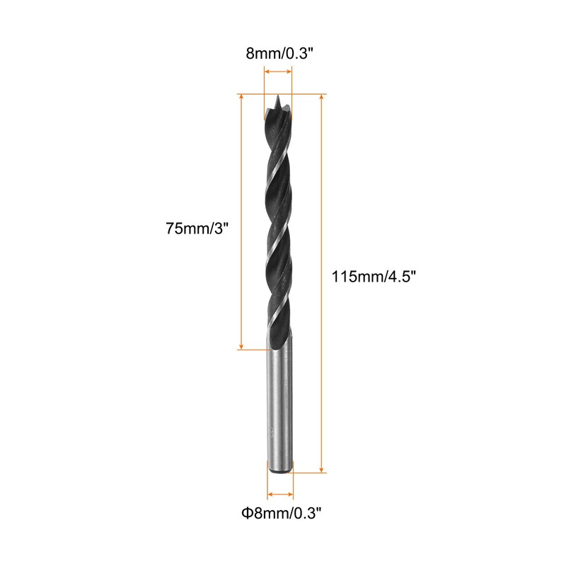 - Size - The brad point drill bits have an overall length of 115mm/4.5", with a diameter of 8mm/0.3" and a straight shank diameter of 8mm/0.3". The maximum cutting depth can be up to 75mm/3".
