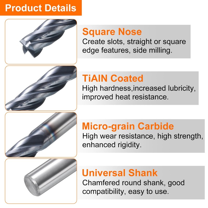 - Material - TiAlN (Titanium Aluminum Nitride) coating provides high hardness, increased lubricity, and improved heat resistance. Performs well under high-temperature cutting conditions and provides good wear resistance. Micro-grain carbide mill bit has high hardness, high wear resistance, high strength, enhanced rigidity and high temperature resistance.