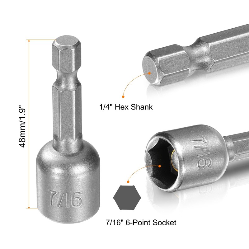 - Size - The SAE 6-point socket size is 7/16", the hex shank is 1/4", and the overall length is 1.9" (48mm).