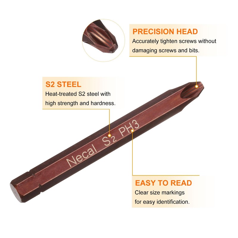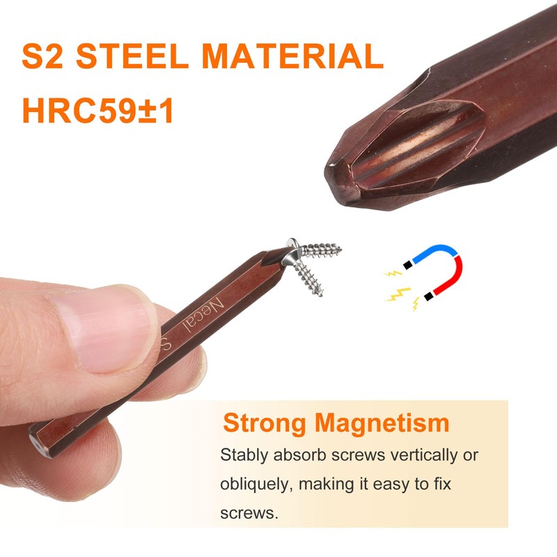 • Material - The screwdriver bits are made of specially heat-treated S2 steel with high strength and hardness (HRC59±1), durable and anti-bending, and the surface is red treatment for enhanced grip and corrosion resistance