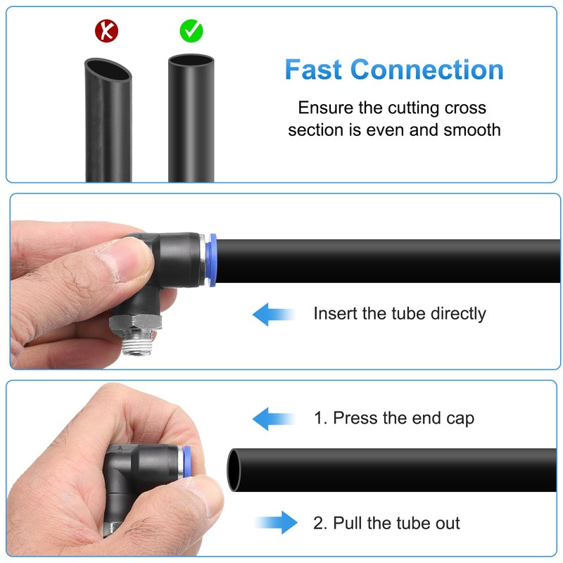 • Quick Connect Fittings - The thickened sealing structure ensures that the connection is completely sealed to prevent liquid or air escape with a working pressure range of 0-1MPa.The elbow design of the air hose fittings can connect two different sizes of pipes, can meet complex wiring requirements.