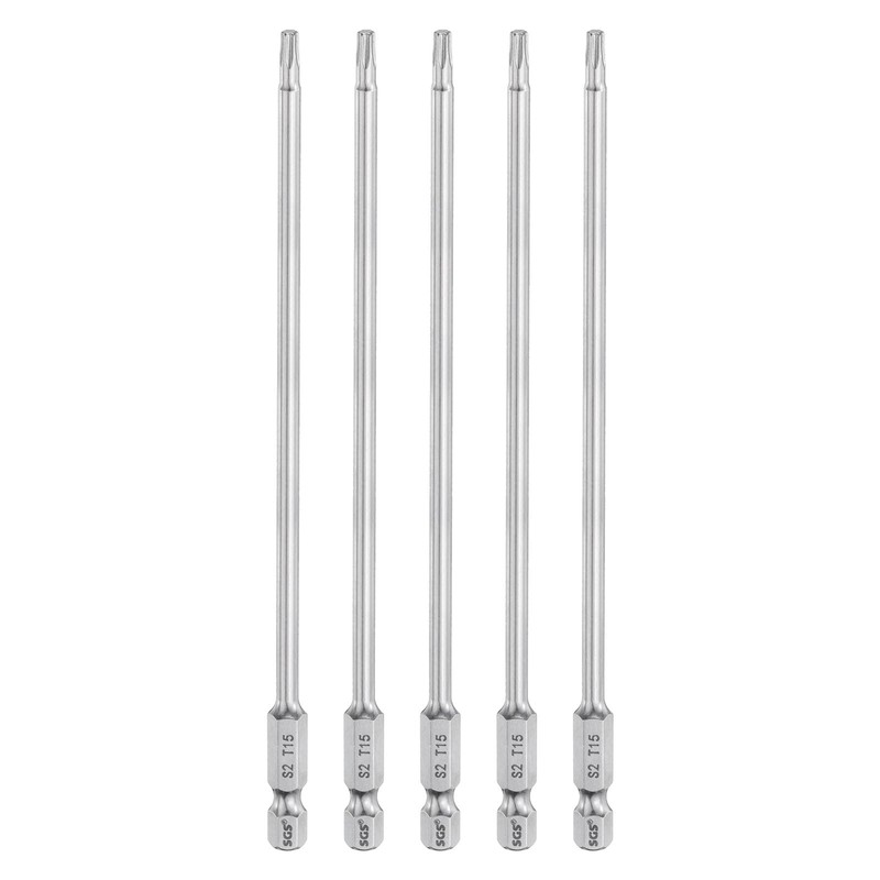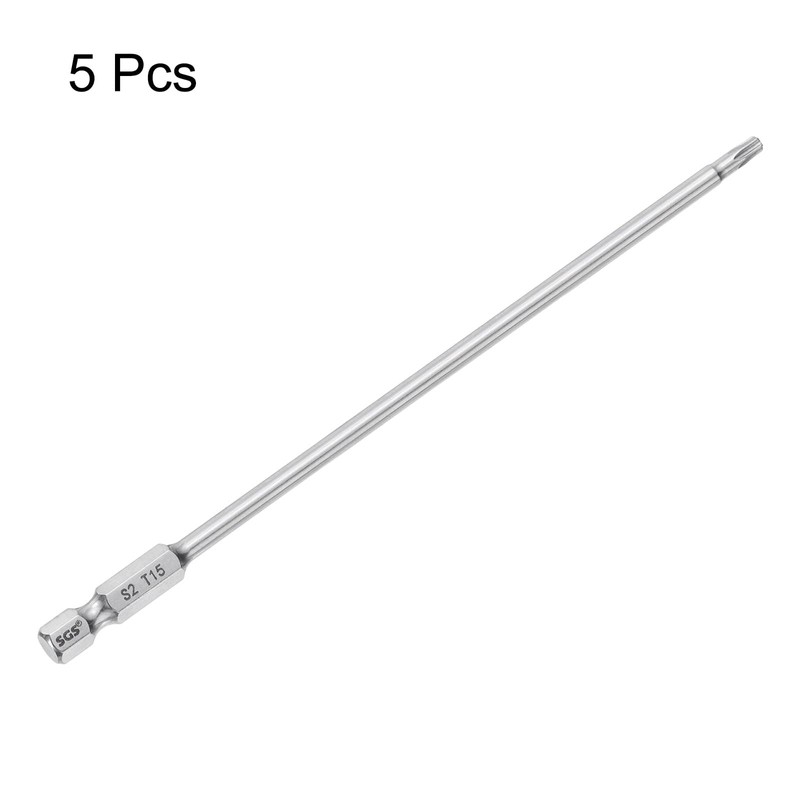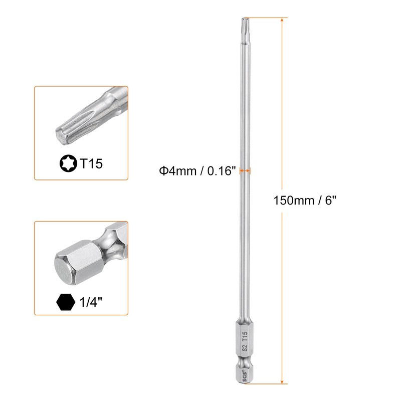 - Size - Star torx bit size: T15, hex shank size: 1/4", total length: 150mm / 6", rod dia.: 3.5mm / 0.14", hardness: HRC58-60, style: torx head with hole. Each hex screwdriver bit is clearly engraved with size number for easy identification.