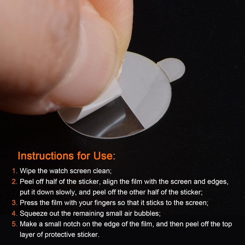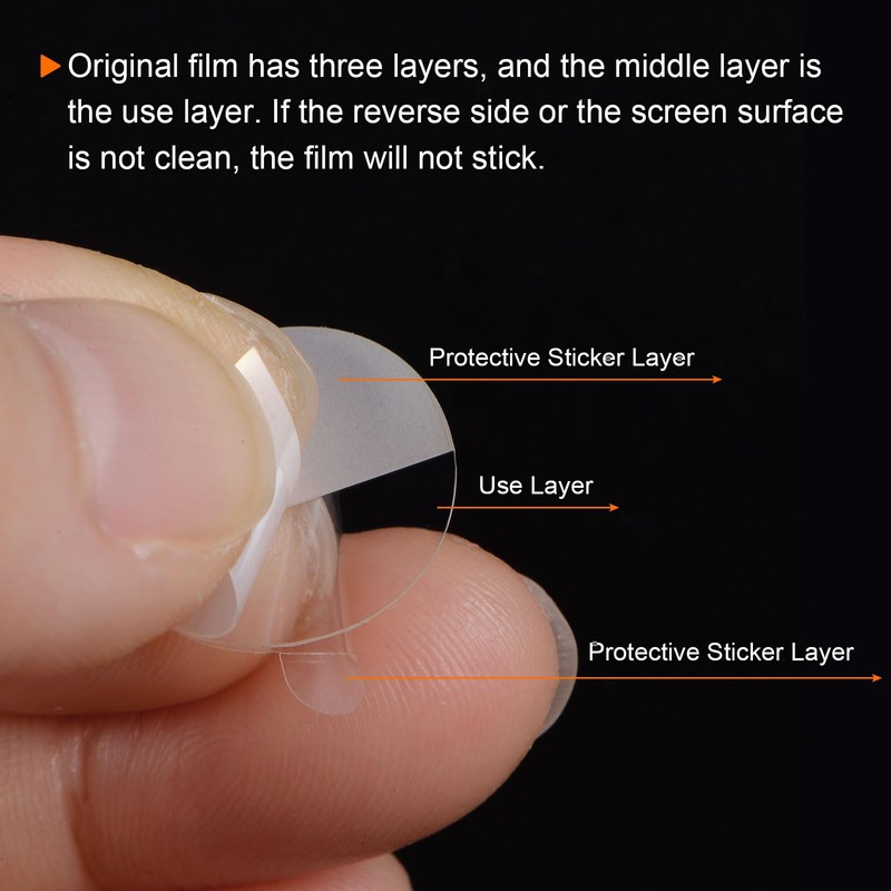 - Applications - The screen protective film is suitable for various types of watches, such as smartwatches, sports watches. Before applying the film, you need to wipe and dry the surface glass screen with alcohol. The original film has three layers, and the middle layer is the use layer. If the reverse side or the screen surface is not clean, the film will not stick.