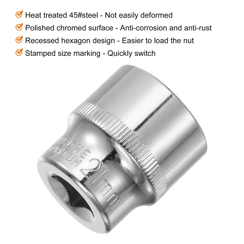 - Material - The socket is made from heat-treated 45# steel, which increases torque and stability and reduces deformation. The polished chromed surface is smooth, helping to prevent rust and corrosion, thereby extending the tool's lifespan.