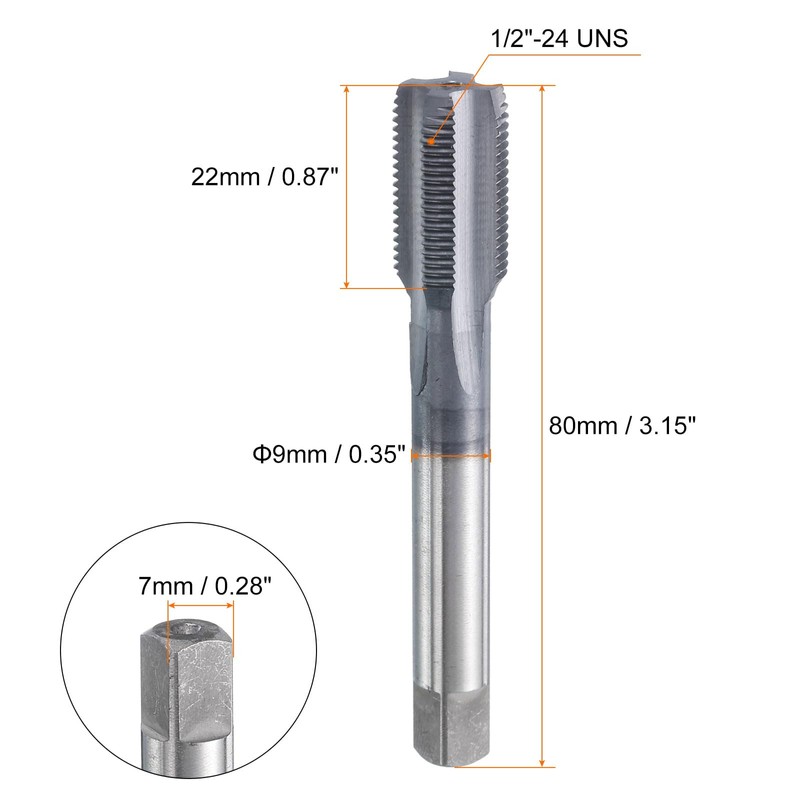 - Size - Thread Size: 7/8"-20 UNS; Shank Diameter: 14mm / 0.55"; Flute Length: 20mm / 0.79"; Total Length: 102mm / 4.02"; Square Head: 11mm / 0.43"; Flute Style: 4 Straight Flutes; Cutting Direction: Right Hand; Style: Flat Head Plug Tap.