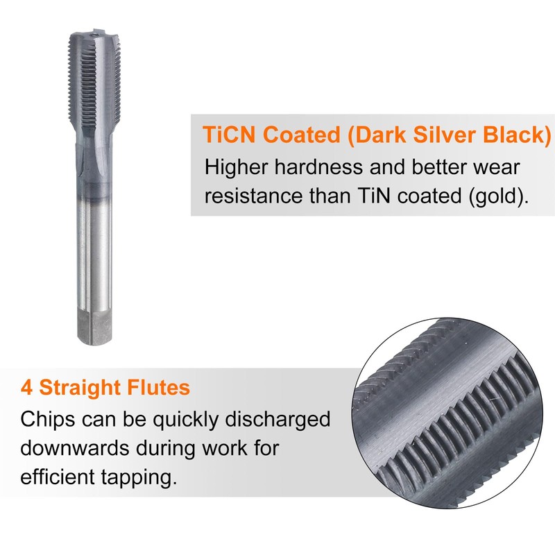 - Material - By adding 5-8% cobalt to a general 6542 high-speed steel thread plug tap, hand taps with cobalt can have higher hardness(67-68HRC) and precision, better wear resistance and toughness, and higher heat resistance. The surface is coated with TiCN (Dark Silver Black), which has higher hardness and better wear resistance than TiN coating (Gold).