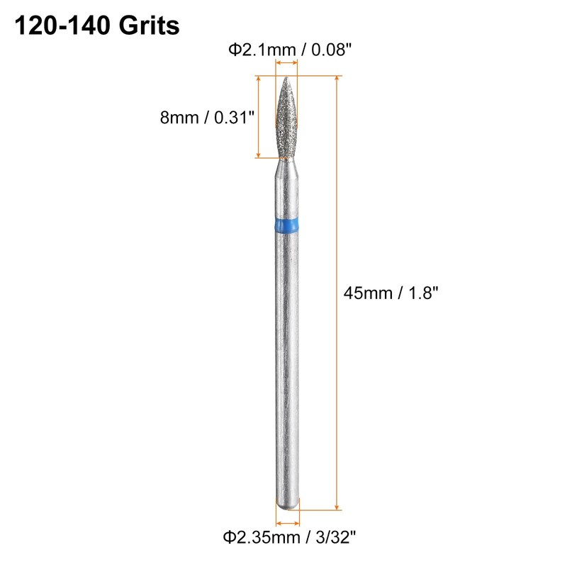 • Size - Grits: 120-140 Grits; Diameter: 2.1mm / 0.08"; Head Length: 8mm / 0.31"; Shank Diameter: 2.35mm / 3/32"; Shank Length: 37mm / 1.46"; Total Length: 45mm / 1.8"; The multi-purpose tool diamond drill bit set is packaged in a sturdy plastic box for your convenience to carry and store