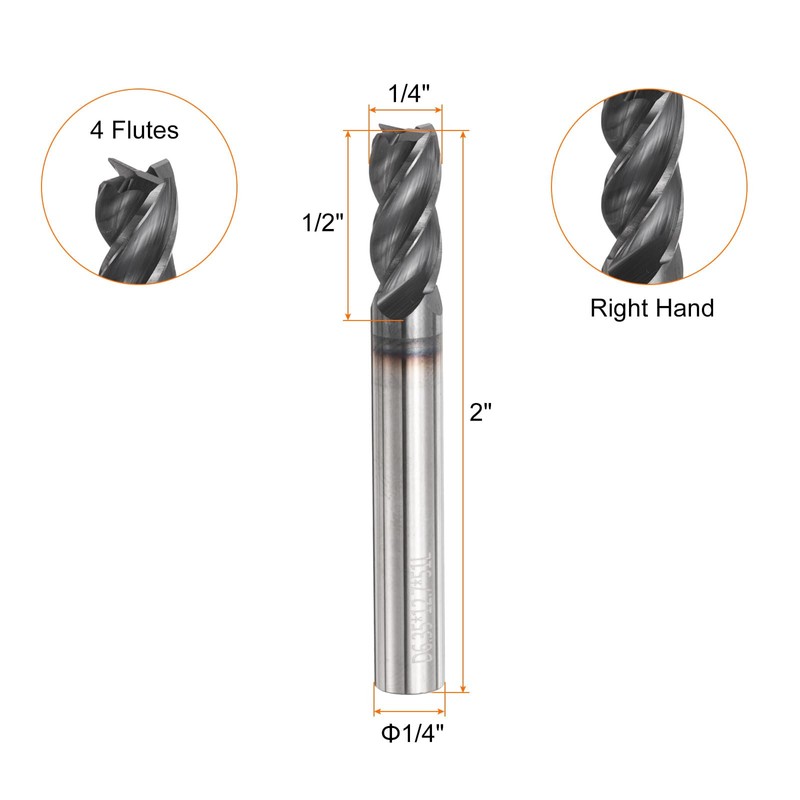 - Size - Cutting diameter: 1/4" (right hand); shank diameter: 1/4"; cutting length: 1/2"; total length: 2"; cutting hardness: HRC53-55; helix angle: 30 degree; number of flutes: 4 flutes. Make sure the end mill is suitable for the specific application and material being processed.