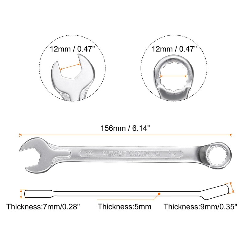 - Size - 12-point Box End & Open End Size: 12mm; Total Length: 156mm / 6.14"; End thickness (approx): 7mm / 0.28", 9mm / 0.35"; 12-Point box end offset: 75°; Angled open end: 15°, suitable for work in hard to reach spaces