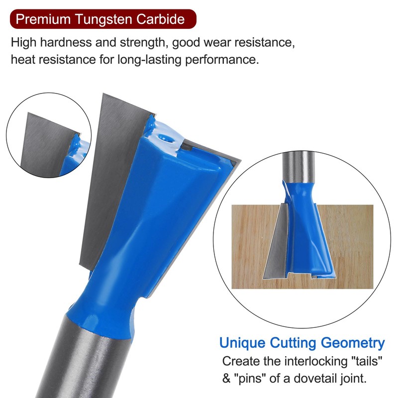 - Feature - Designed to create the interlocking "tails" and "pins" of a dovetail joint, providing strength, durability, and aesthetic appeal. Dovetail router bits feature angled sides and a flat bottom for precise and secure fitting. 2-flute router bits facilitates efficient chip evacuation.