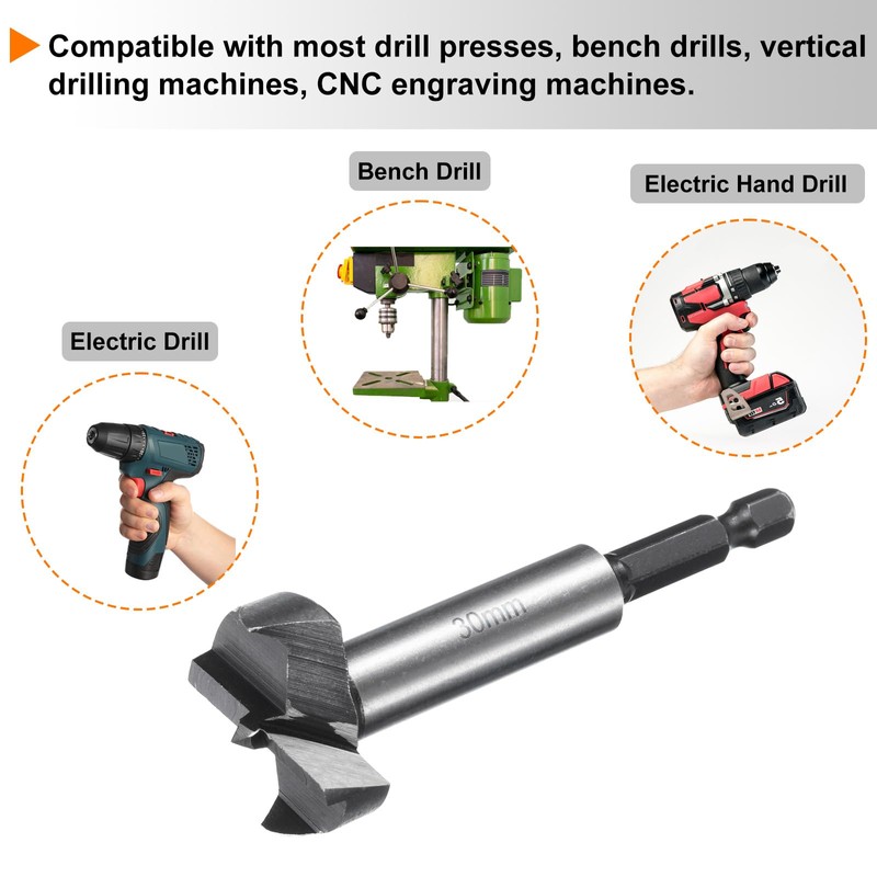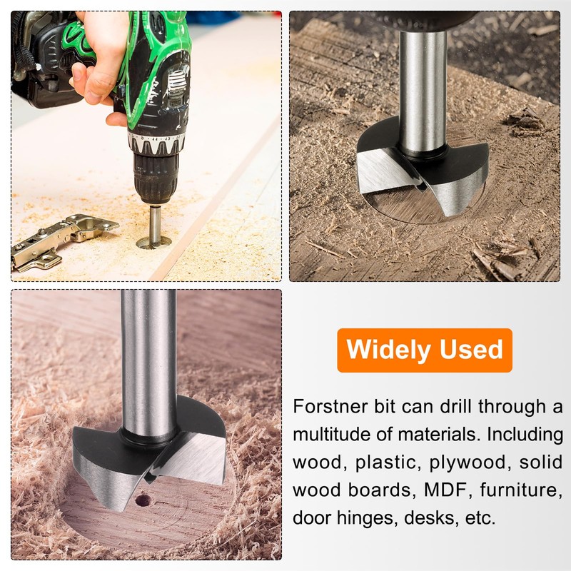 - Application - The Forstner hole saw will drill through a multitude of materials. Such as wood, plastic, plywood, solid wood boards, MDF, plastics, furniture, door hinges, desks, etc. It can be used in a drill press, bench drill, vertical drilling machine, CNC carving machine, etc.