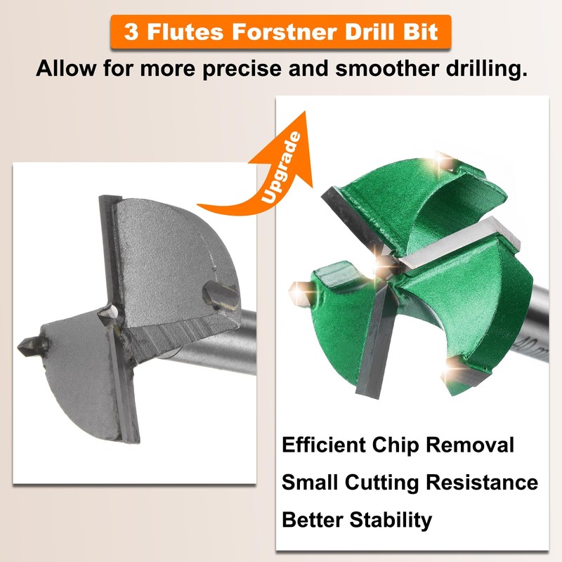 Upgraded 3-flute 4-spur forstner drill bit facilitates efficient chip evacuation and reduces cutting resistance, helping to create a cleaner entry hole and providing better stability. The extra flutes and spurs allow for a more precise and smoother drilling, making it suitable for projects that require high precision and a high finish.
