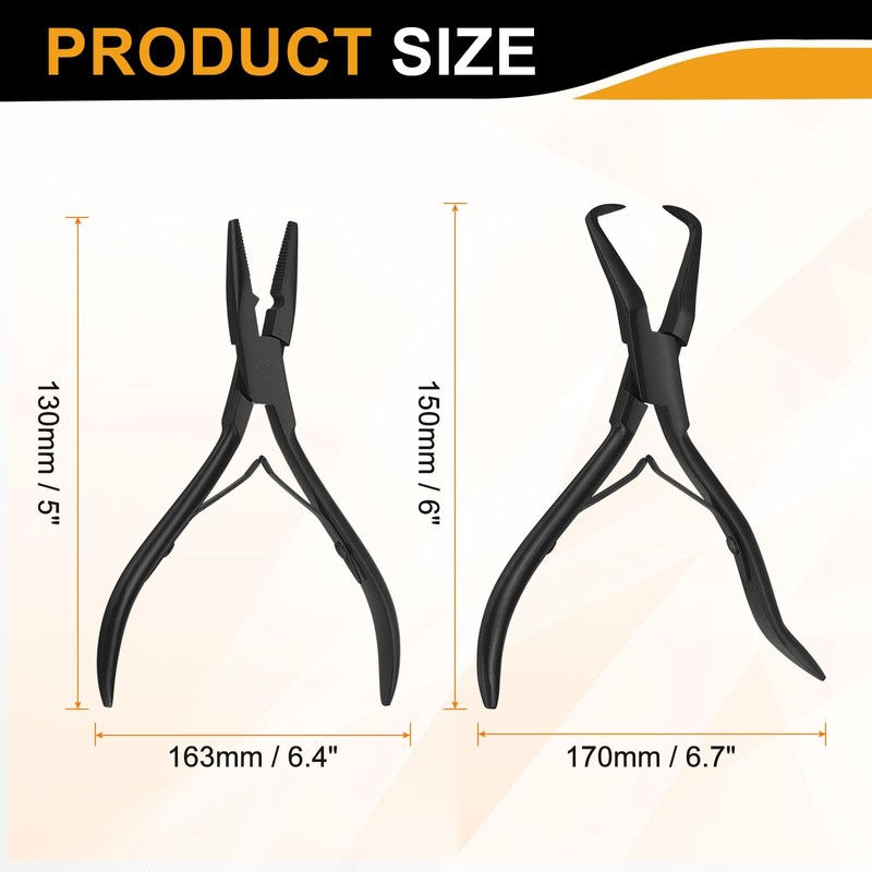 - Material - Hair extension tool set is made of heat-treated stainless steel 3Cr13 with blackened surface. The micro bead hair extension closer pliers are designed to clamp and open micro link beads, while the hair extension remover pliers are mainly used to squeeze into and open loops, both of which are suitable for hair extension micro links, hair tinsel strands, and feather hair applications.