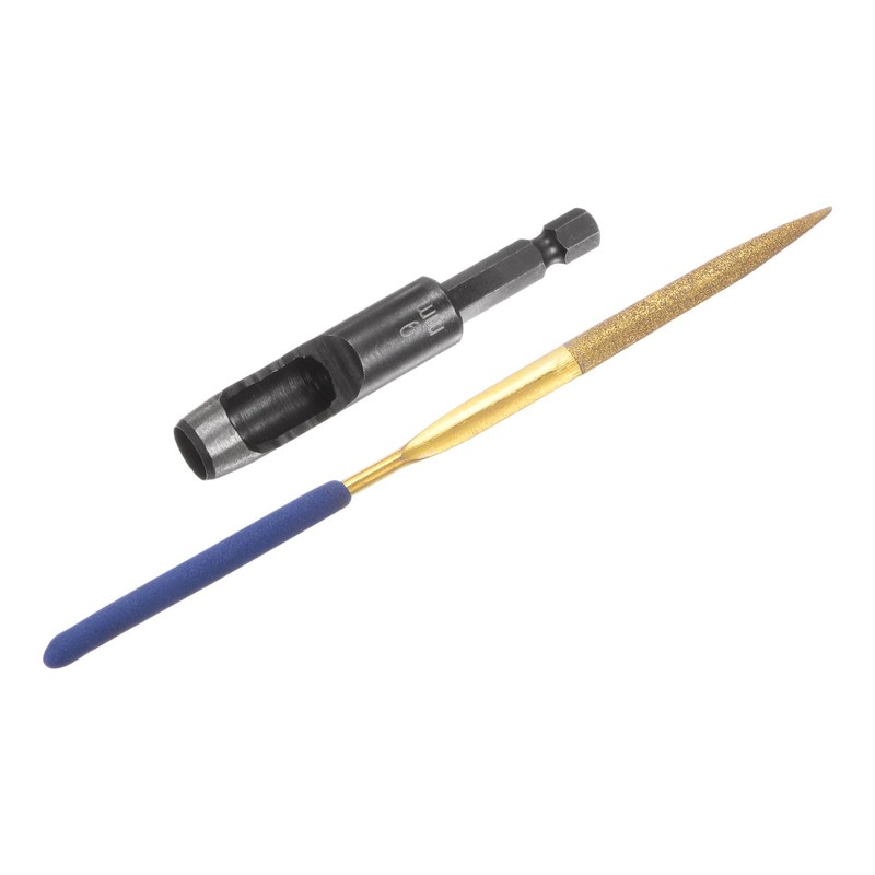 - Size - 9mm fabric hole punch tool, shank dia 1/4”, total length 74.5mm / 2.9" with total length 140mm / 5.5" half-round file.