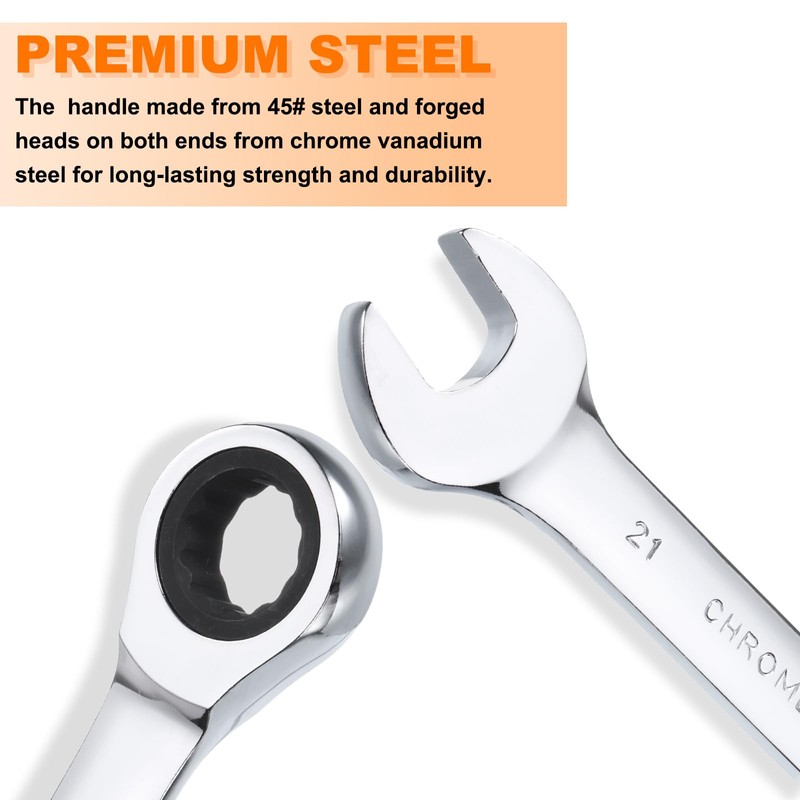 - Material - This metric gear ratchet has a handle made from 45# steel and forged heads on both ends from chrome vanadium steel for long-lasting strength and durability. The finish is polished and chrome plated, making the spanner bright, smooth, rust and corrosion resistant.