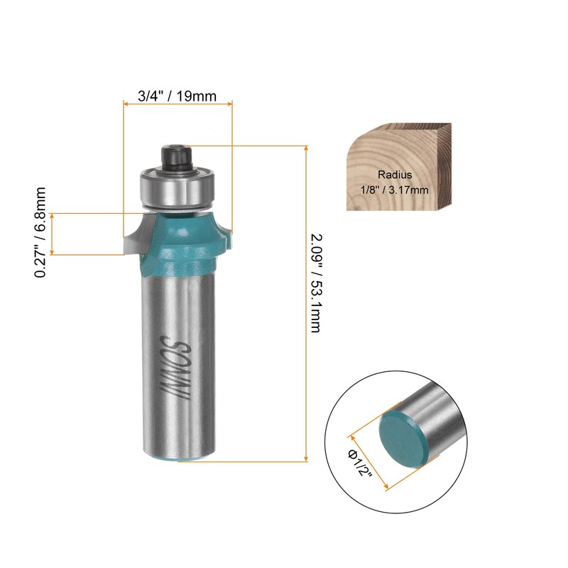 - Roundover Router Bit - Radius: 1/8" / 3.17mm, Shank Diameter: 1/2", Cutting Diameter: 3/4" / 19mm, Cutting Depth: 0.27" / 6.8mm, Total Length: 2.09" / 53.1mm.