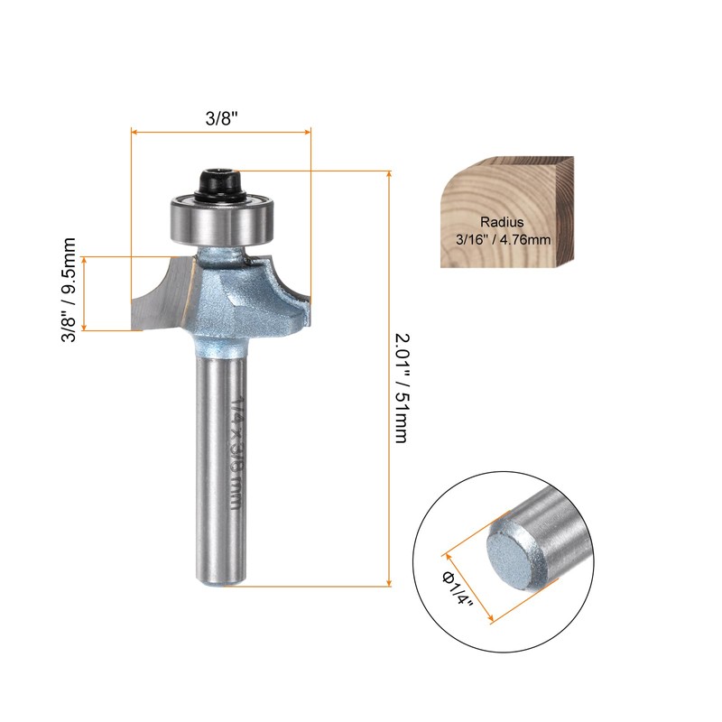 - Roundover Router Bit - Radius: 3/16" / 4.76mm, Shank Diameter: 1/4", Cutting Diameter: 3/8", Cutting Depth: 3/8" / 9.5mm, Total Length: 2.01" / 51mm.