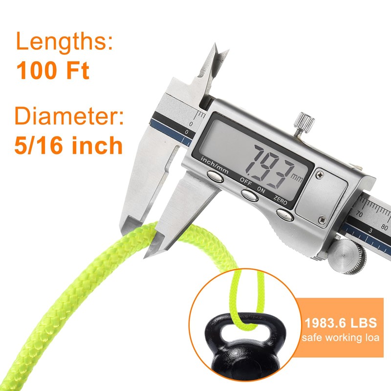 • Size - Solid Braid Nylon Rope/Utility Rope/Multi-Purpose Rope is available in 100 Ft lengths and 5/16 Inch diameter thickness, and tensile strength (safe working load) is 1983.6 LBS.
