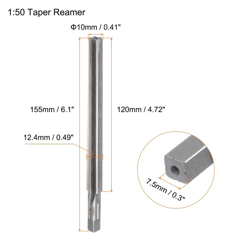 - Size - 1:50 taper reamer; cutting diameter: 10mm / 0.41" (small), 12.4mm / 0.49" (big); accuracy: H8; tool flute length: 120mm / 4.72"; square shank diameter: 7.5mm / 0.3"; overall length: 155mm / 6.1"; flutes quantity:6.