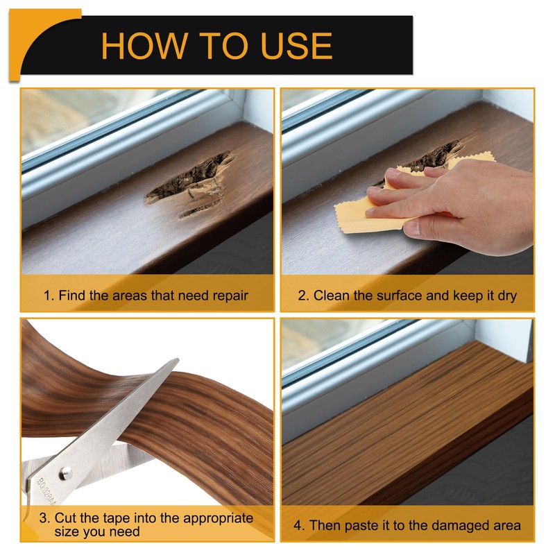 - Application - Realistic wood grain repair tape is suitable for renovation, repair, scratch or crack covering of tables, chairs, cabinets, bookcases, floors, skirting boards, doors, windows, walls, etc., as well as decorative projects and daily DIY. Equipped with a scraper, you can scrape effectively to eliminate bubbles to ensure a firm and even paste.