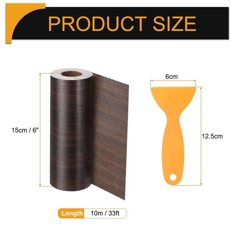 - Size - Length: 10m / 33ft, Width: 15cm / 6", Thickness: 0.2mm / 0.008", Style: Black Walnut Grain. Package Content: 1pcs x Wood Grain Repair Tape, 1pcs x Scraper. The simulated wood patch can be easily cut into any length and shape as needed to meet different repair needs.