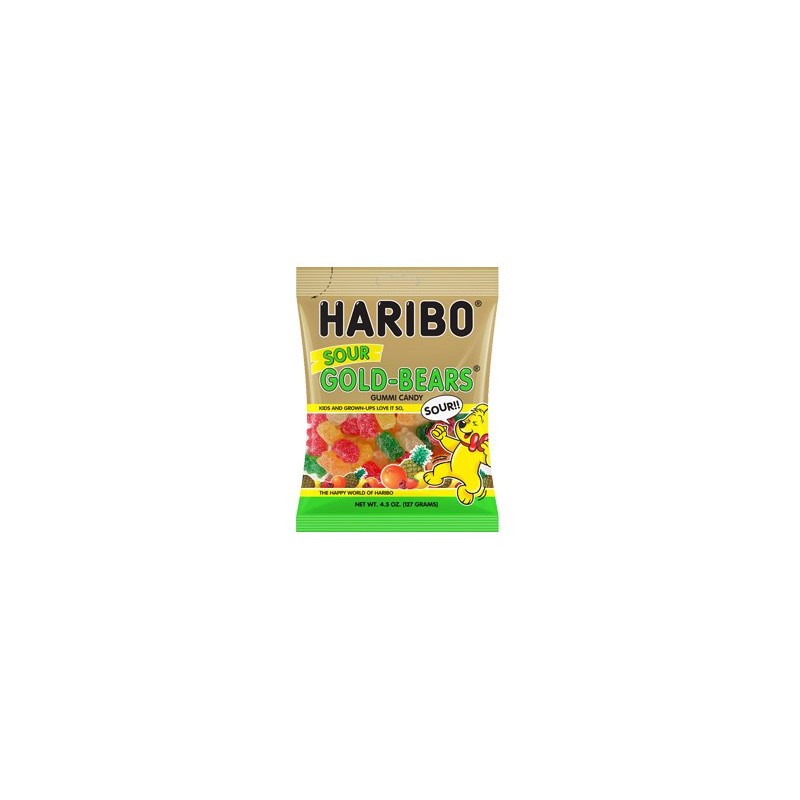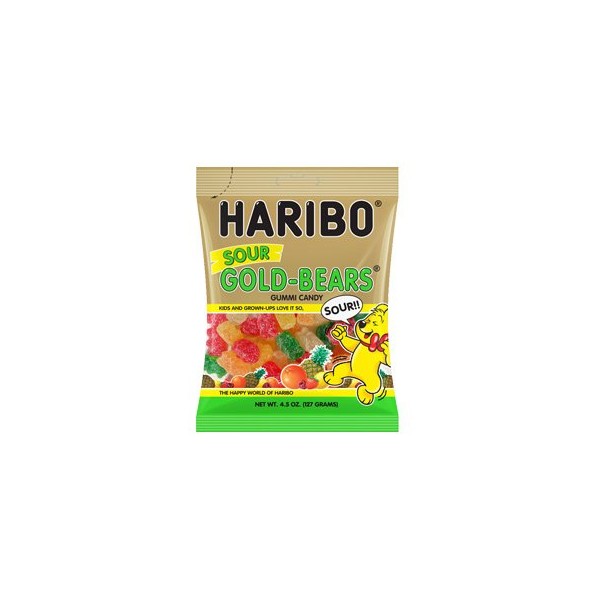 Haribo Gold Bears Sour Gummy Candy, 4.5 Ounce -- 12 per case. The original gummi bears with a sour, tangy coating: HARIBO SOUR GOLD BEARS in the flavors lemon, orange, pineapple, raspberry and strawberry
