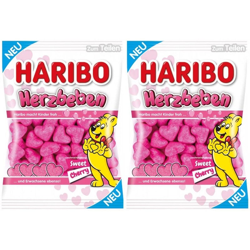 Imported European Haribo Herzbeben Sweet Cherry Gummy Candy. Pink hearts made of soft foam sugar with a sweet candied cherry flavored coating. Two packs, 160g each.