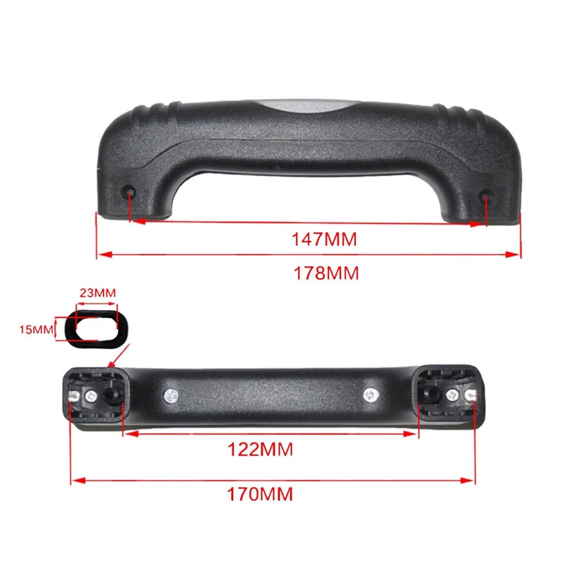Description: - MATERIAL: Made of high quality material, sturdy and durable. - Design: Ergonomic handle, non-slip. - REPLACEMENT: Can be used to replace the old handle. - EASY INSTALLATION: Easy installation, fixing with screws. - APPLICATION: Suitable for suitcases, travel luggage, suitcases etc. Size Chart: - : Total Length: 17.8cm/7.01" - Handle Outside Distance: 17cm/6.69" - Mounting Screw Spacing: 14.8cm/5.83" - Handle Inside Distance: 12.2cm/4.80" - Oval Nozzle: 2.3 cm x 1.5cm/0.91" x 0.59" - Style B: Total Length: 16.5cm/6.50" - Handle Outside Spacing: 15.8cm / 6.22" - Mounting Screw Spacing: 13.5cm/5.31" - Handle Inside Distance: 11.1cm/4.37" - Oval Nozzle: 2.33" cm x 1,5cm/0.91" x 0.59" - Style C: Total Length: 18.1cm/7.13" - Handle Outside Distance: 17.7cm/6.97" - Mounting Screw Spacing: 14.3cm/5.63" - Handle Inside Distance: 11cm/4.33" - Oval Nozzle: 3.4 cm x 1.9 cm/1.34" x 0.75"Package Includes:- 1 Luggage Trolley HandleNote:Please allow slight errors due to manual measurement and different monitors.