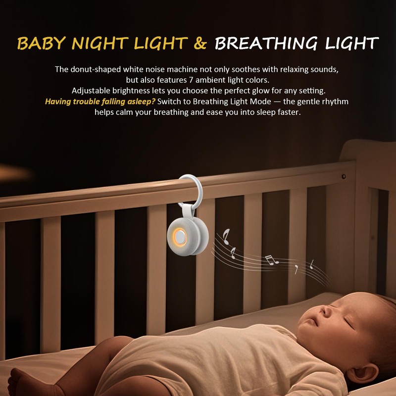 - BABY ESSENTIAL:Our sound machine comes with two hanging attachments, allowing you to hang it on strollers, cribs, baby carriers, and more. The night light’s low brightness setting helps moms nurse their babies at night without disturbing sleep. The wireless, portable sound machine is perfect for moving around anywhere in the house.