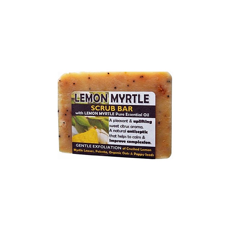 The Lemon & Myrtle Scrub Bar has a pleasant & uplifting sweet citrus aroma and a natural antiseptic that helps to calm & improve your complexion. It provides gentle exfoliation with crushed lemons, myrtle leaves, polenta, organic oats & poppy seeds.