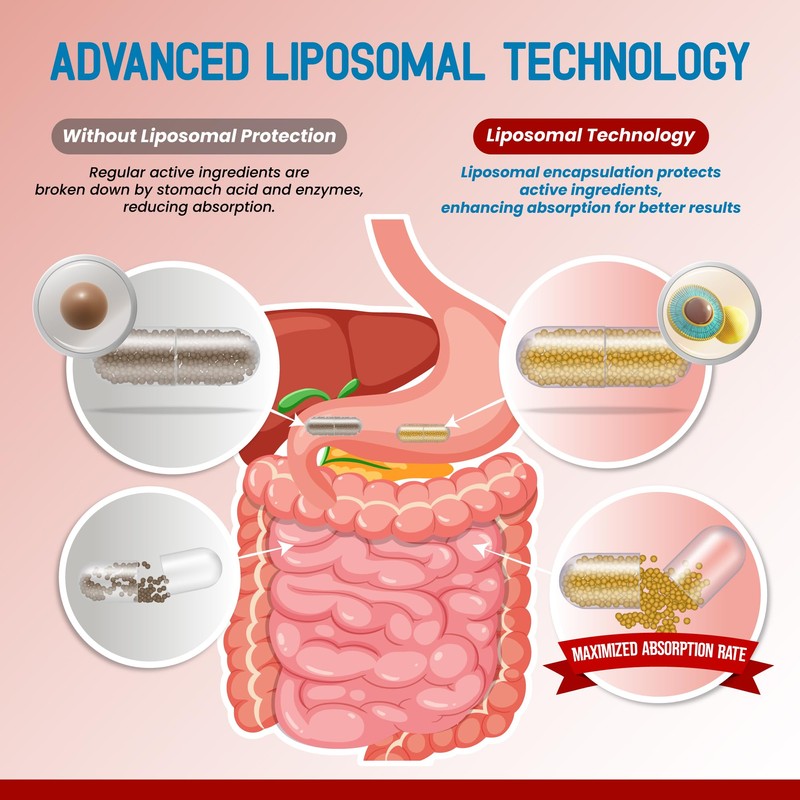 - Advanced Liposomal Technology – Unlike traditional methods, this technology boosts nutrient absorption by creating a protective layer around active ingredients, shielding them from digestive enzymes, stomach acid, and oxidation, ensuring more nutrients reach your body