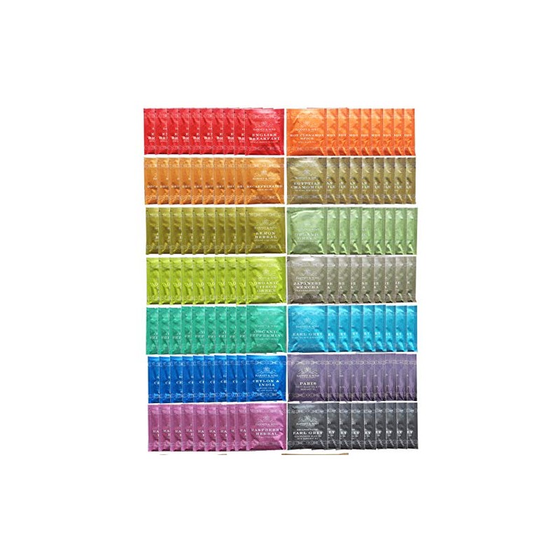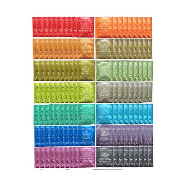 Harney & Sons Assorted Tea Bag Sampler 140 Count Great for Breakrooms, Offices, Food Service Tea Sampler. Featured Flavors: Hot Cinnamon Spice, English Breakfast, Lemon Herbal, Egyptian Chamomile, Decaf Earl Grey, Organic Peppermint, Earl Grey, Raspberry Herbal, Decaf Ceylon, Organic Green with Citrus and Ginkgo, Ceylon & India, Organic Citron Green, Paris, and Japanese Sencha