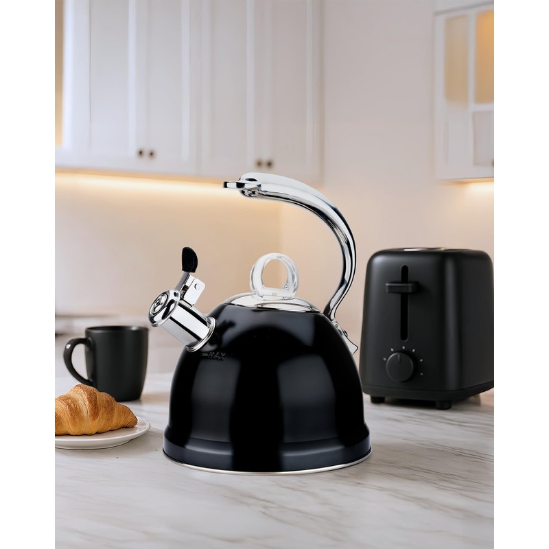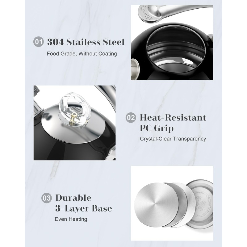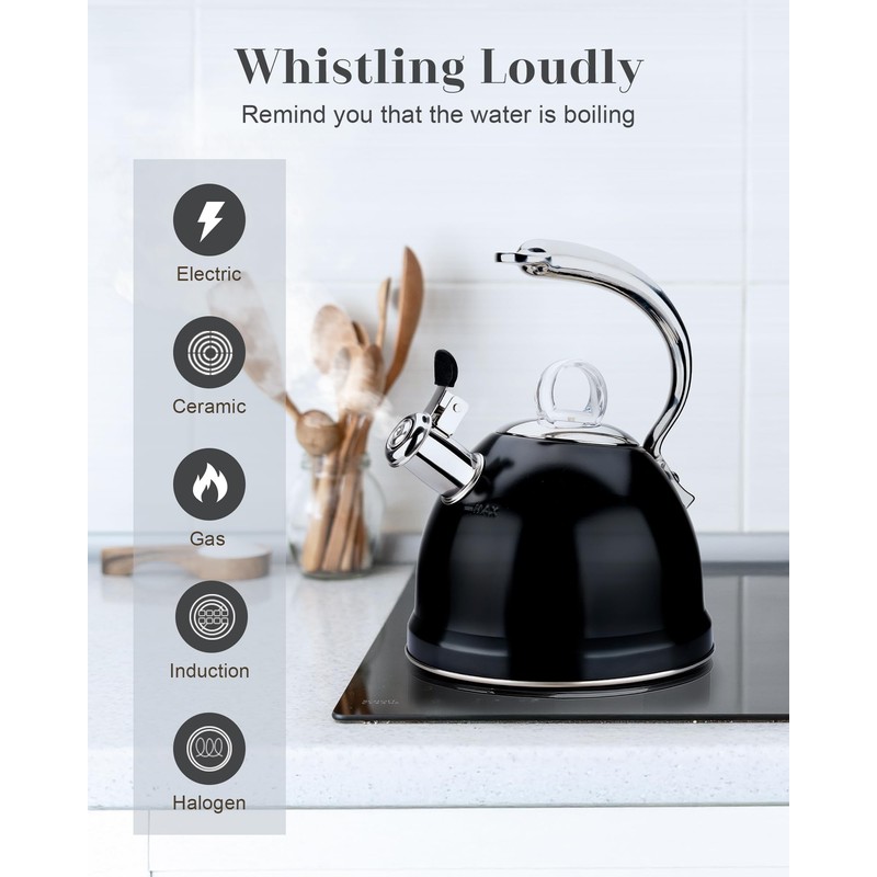 Harriet Tea Kettle Stovetop, 2.5 QT Whistling Stainless Steel Teapot, 3-Layer Base, Unique Ergonomic Handle, Includes Pot Holder & Mat, Electric/Induction/Gas Stovetops Applicable, Black