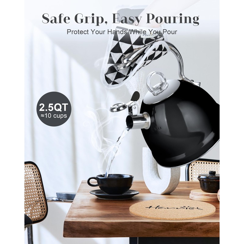 For added convenience and safety, this kettle comes with a heat-resistant holder and pad to protect your hands from burns while handling it after use. With a generous 2.5QT capacity, it's perfect for larger families, gatherings, or anyone who enjoys a hot cup of tea or coffee throughout the day.