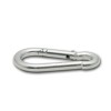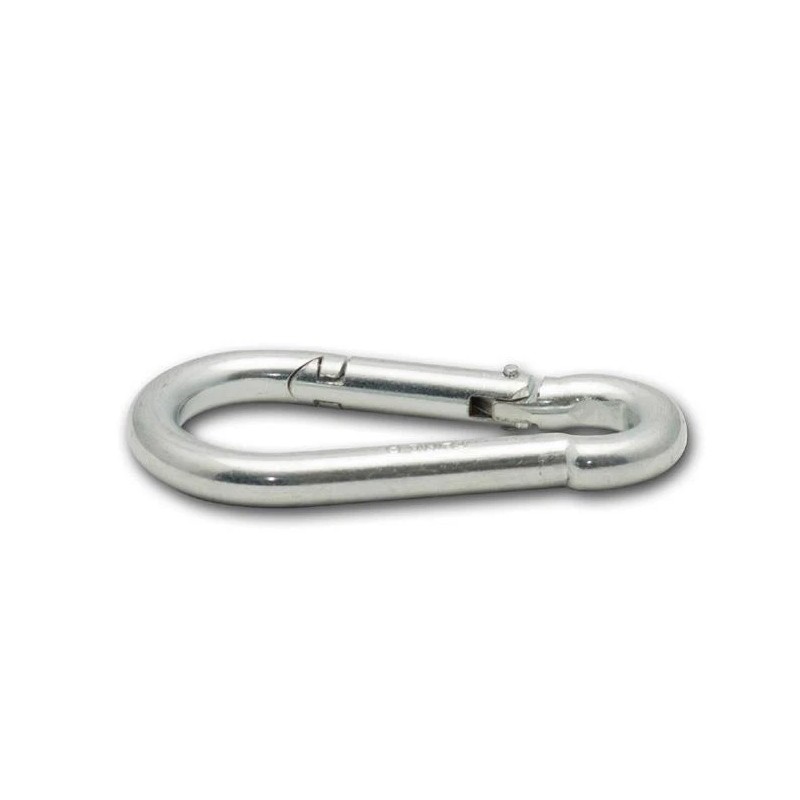 These premium snap hook carabiners are made from heavy duty silver zinc plated steel. Snap hook carabiners are commonly used with a variety of products including ropes, chains, straps, etc. Latch pushes in to open and closes automatically by a spring. Interlocking teeth prevent the hook from being forced open. DO NOT use this product for overhead lifting, cargo control, rigging, or climbing applications.