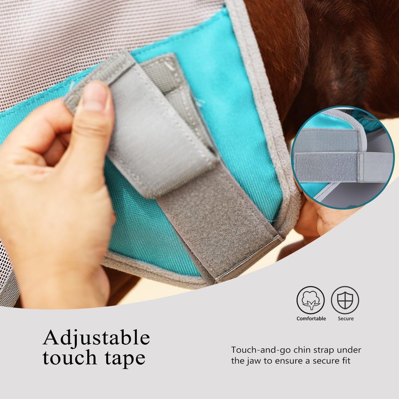 - SECURE FIT OVER THE BRIDLE: Easily and quickly attaches over the bridle. One adjustable touch-and-go tape under the jaw ensures a safe closure for a proper fit while allowing the mask to stay in place.