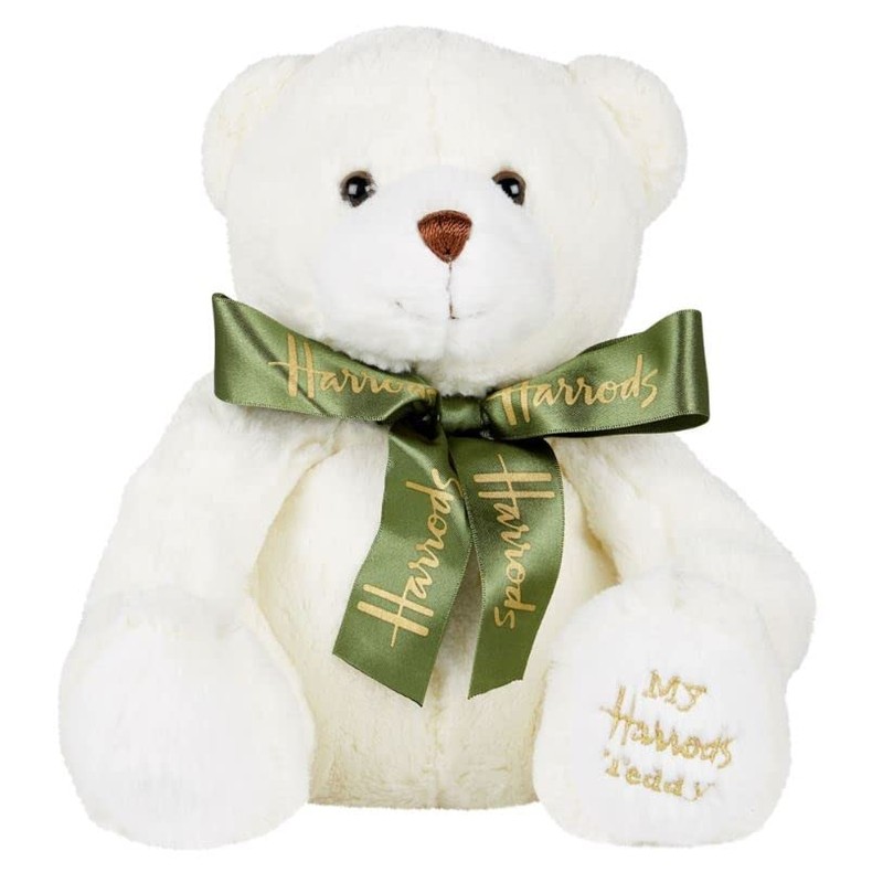 - This cute teddy bear from Harods, has been loved as collectors items for generations. It is accented with a ribbon with halos logo tied around the neck and embroidered logo on the bottom of the foot