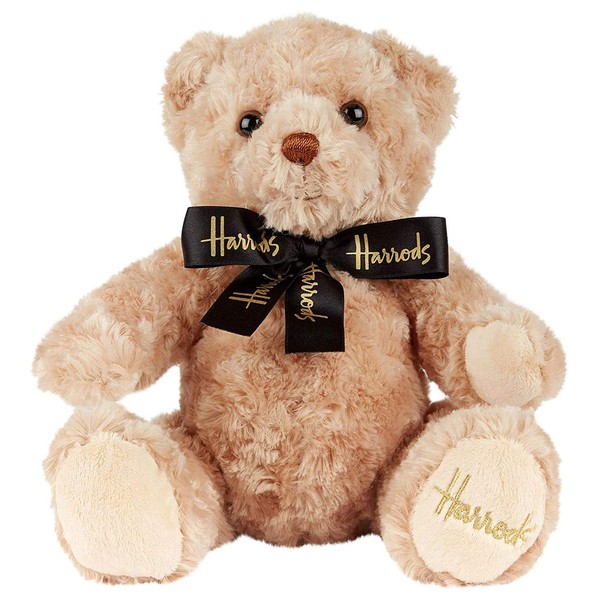 Material: 100% recycled polyester; Product Dimensions: Total Length: 14.2 inches (36 cm); Height when sitted: 9.4 inches (24 cm); From hip to leg opening; Brown bear has a ribbon with black halos logo on the neck for a cute look. Perfect for those who are looking for a bear that doesn't wear outfits! Of course, the Harrods logo is also embroidered on the back left leg. You will be delighted by a baby shower celebration.