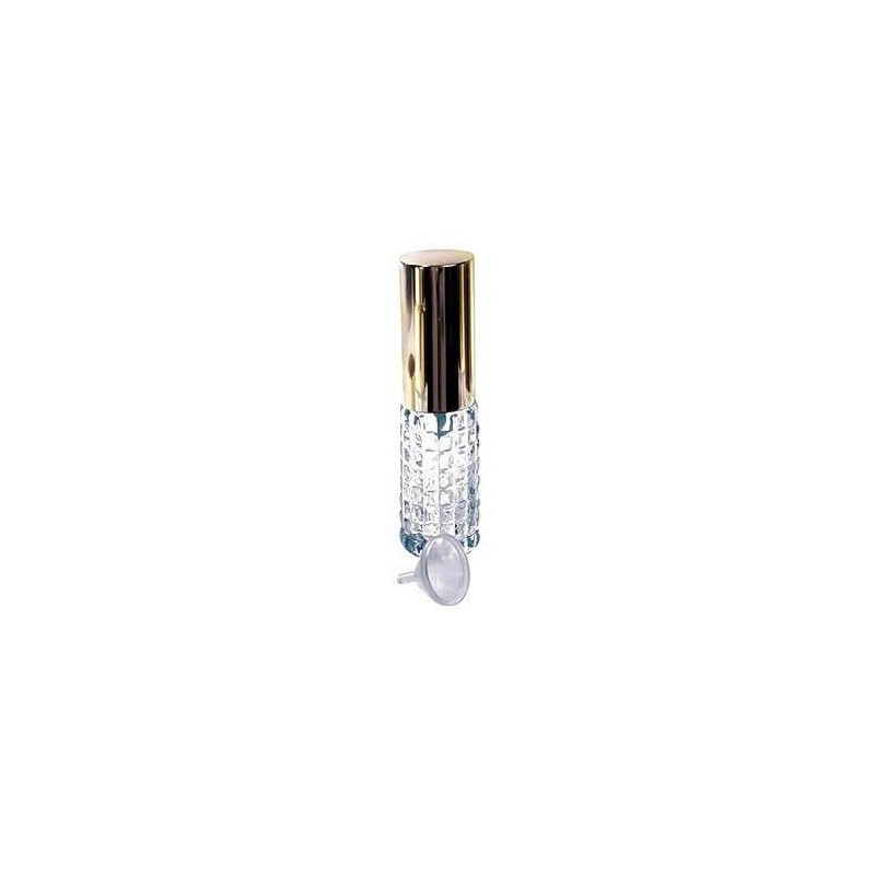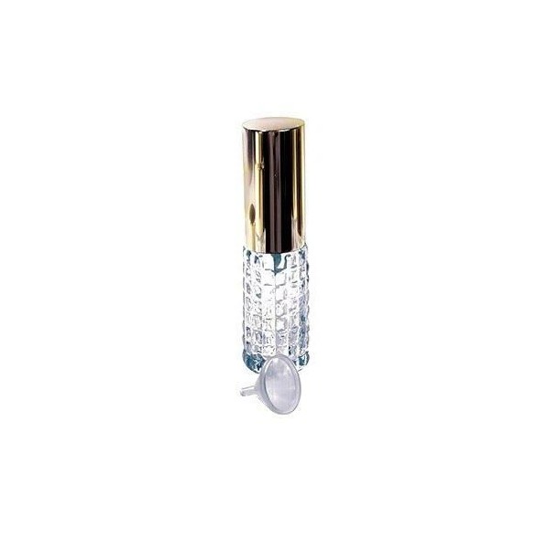 Purse/Travel Size Glass Atomizer With Funnel-Assorted Styles Grab and go with this great mini purse sized atomizer. Fill with your favorite scent, or mineral water for spritzing and you're all set ! Comes in assorted cut glass patterns with a handy mini funnel and a gleaming gold-toned cap. Holds .35 ounces Assorted patterns Mini funnel included