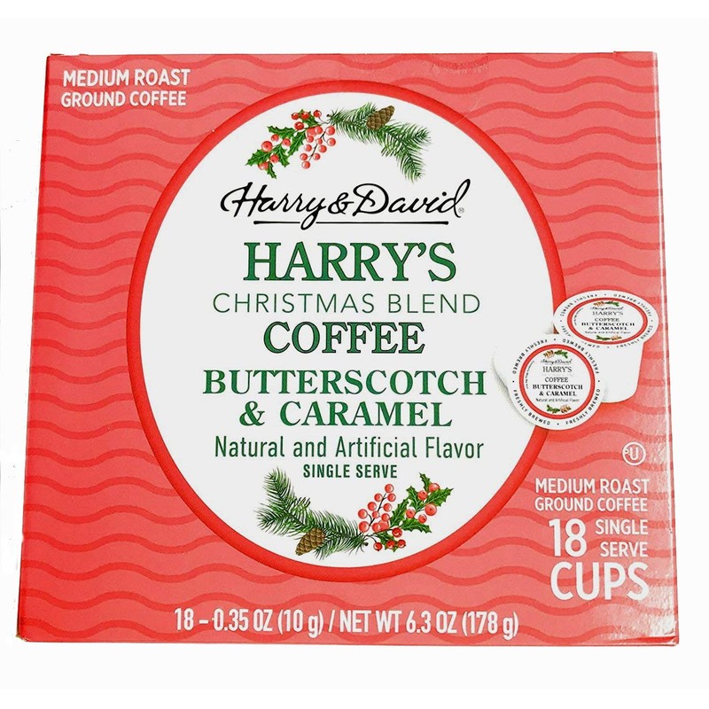 - CHRISTMAS COFFEE: This is a box of 18 individual coffee pods featuring Harry & David's Butterscotch Caramel flavor.