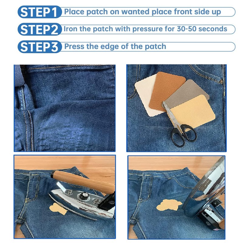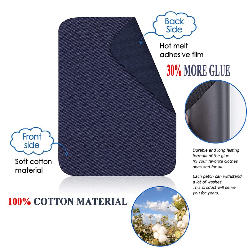 - [Adhesive Patches] Crafted from complete cotton with a polyamide adhesive, thesefabric patches are ideal for repairing your favorite pants with holes or tears. They canalso bring a modern, sophisticated touch to an old pair of pants
