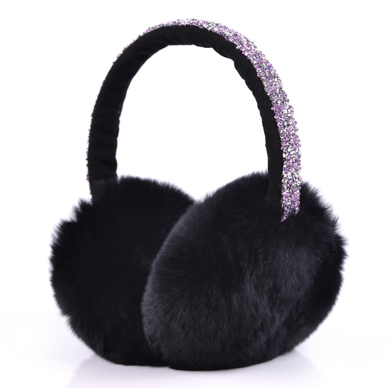 Harssidanzar HL306EU Women's Winter Earmuffs, Real Rabbit Fur Earmuffs, Adjustable Earmuffs, Rhinestone Earmuffs, black