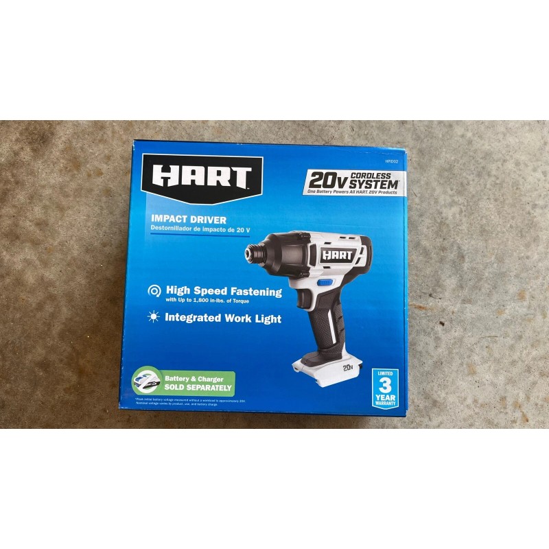 - Features: Over 300 screws driven per charge, up to 1,800 in-lbs. of torque, Variable speed trigger from 0-2,600 RPM, ¼” quick connect chuck, LED worklight, Convenient on-board bit storage, Works with all HART 20v batteries, Includes Phillips Bit, 4 Ah Battery provides 4x the runtime, 4Ah Battery provides 4x the runtime, On-board LED Battery gauge, On-board LED fuel gauge, Includes a fast 2 AMP charger, Highly Rated