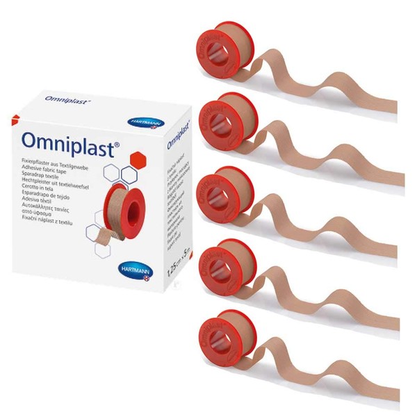 The fixing plaster Ominplast from Hartmann is offered here as a practical set of 5 rolls. It is tensile resistant, hypoallergenic and suitable for any type of dressing fixation.